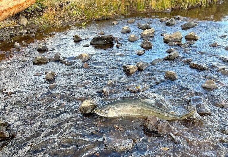 A fall-run Chinook salmon seen on Oct. 16, 2024, in a tributary of the Klamath River located above the former J.C. Boyle Dam. The fish is the first to return to the Klamath Basin in more than a century, following the recent removal of the four dams on the Klamath River.